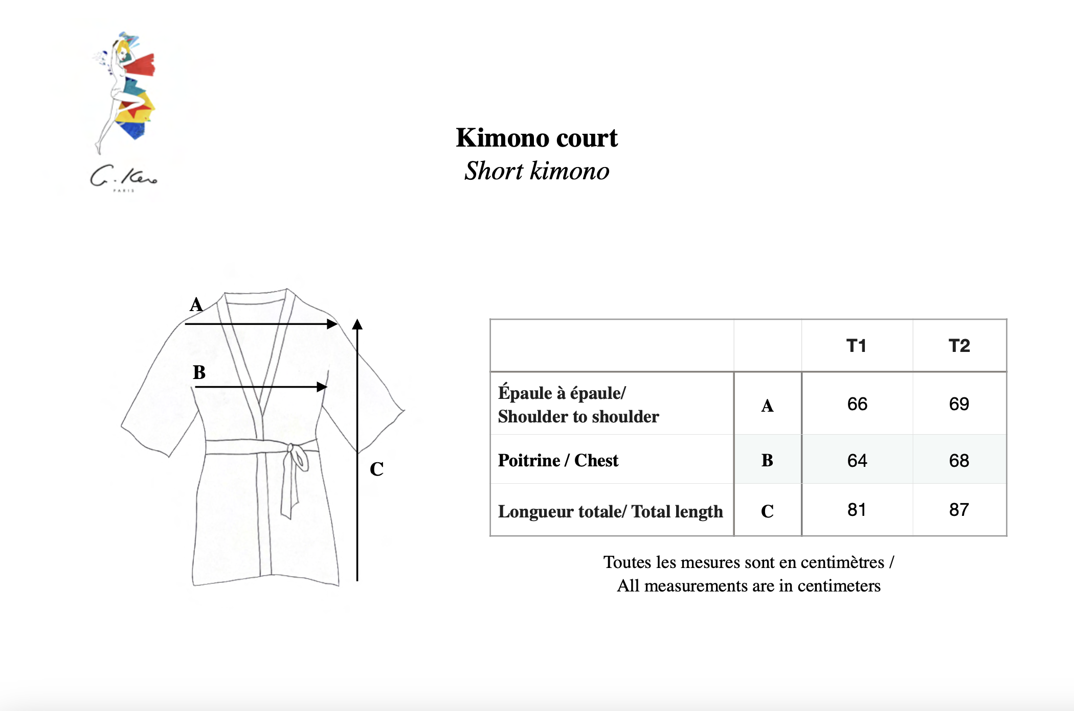 -Short Silk twill kimono. 3/4 sleeves. Silk belt printed with the same design.