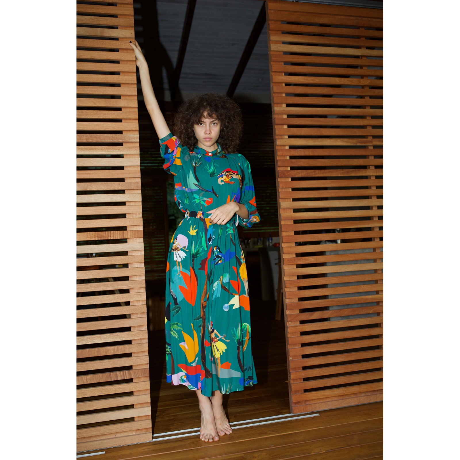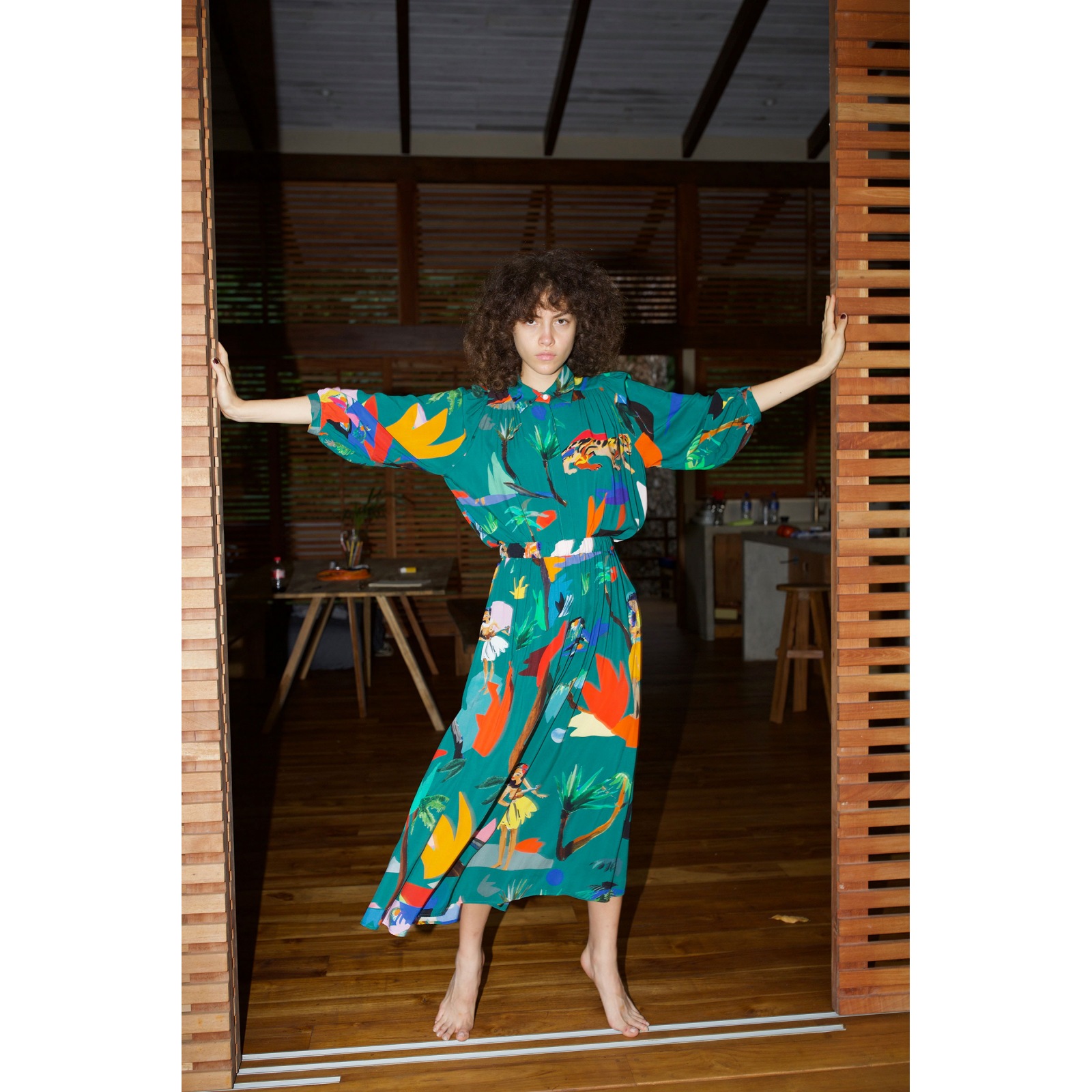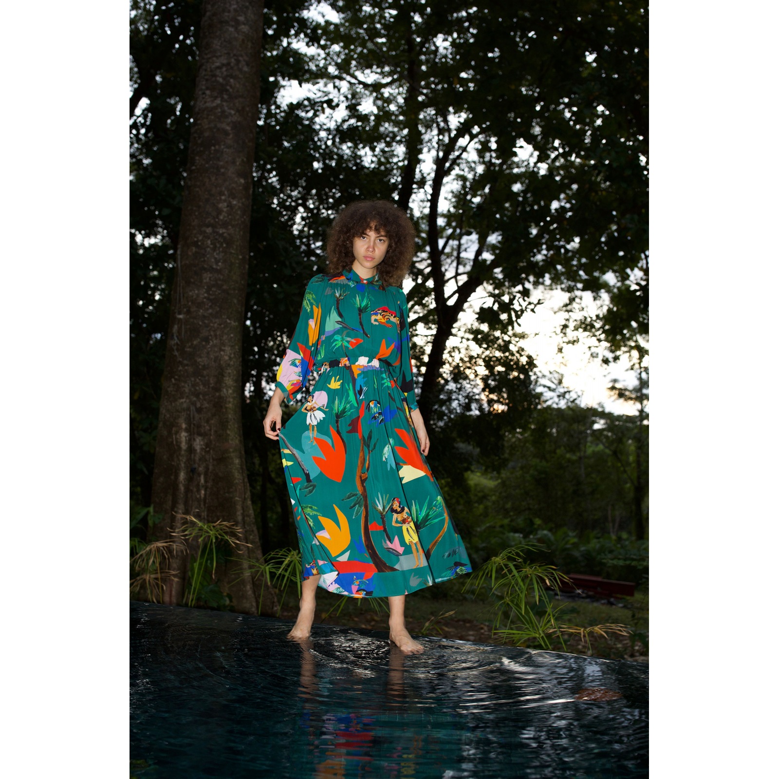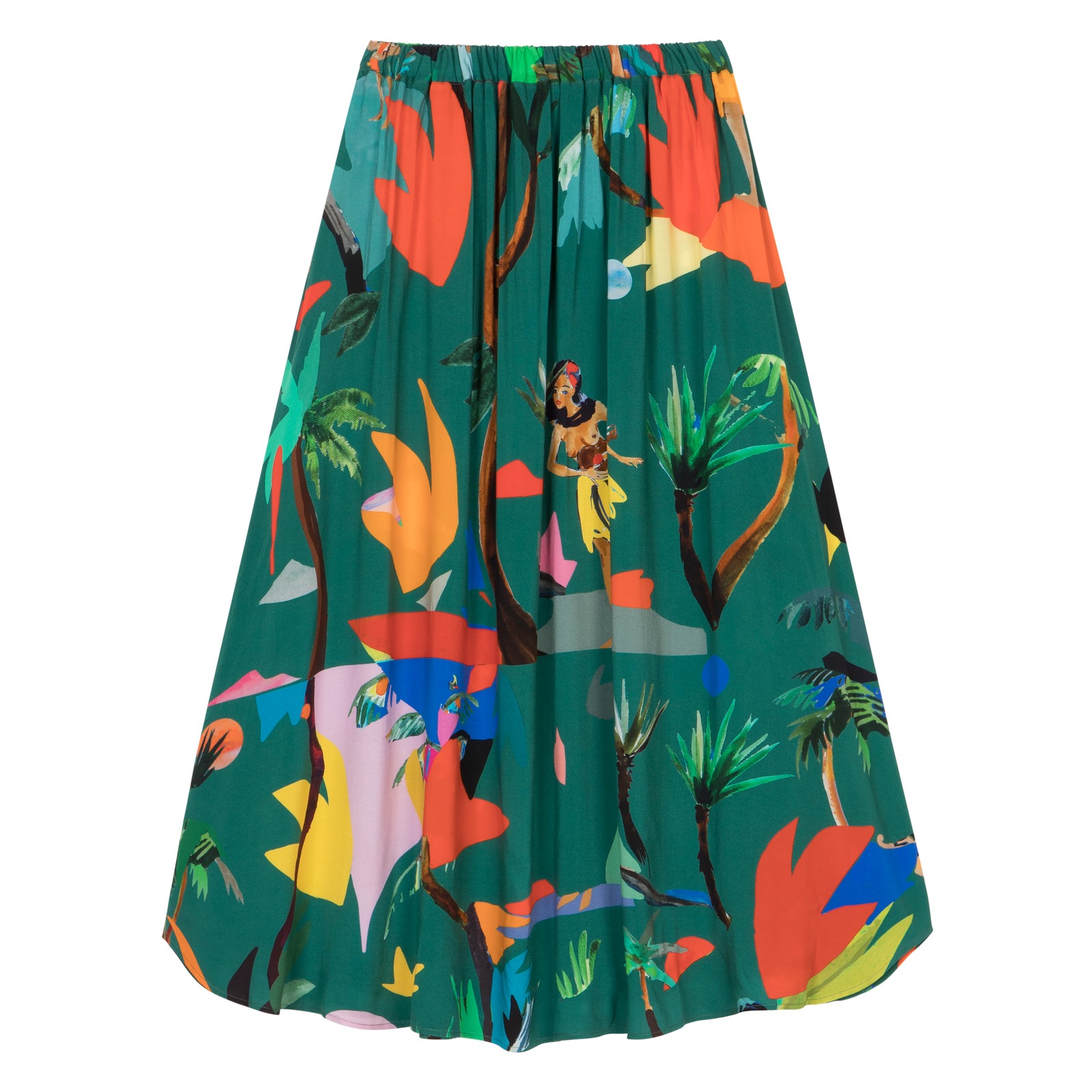 Ultra soft viscose high-waisted viscose skirt with elastic waistband. Printed with jungle and Hawaiian patterns on a green background. Numbered serie. The name of this artwork is "Green Moon".