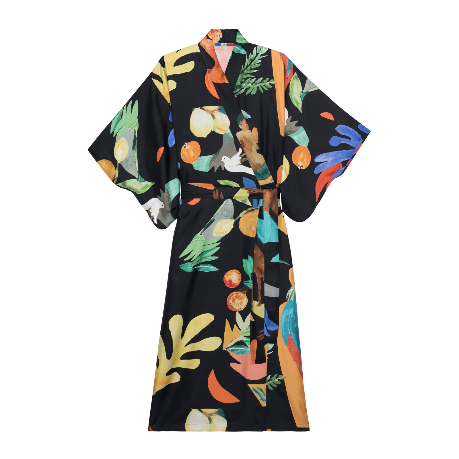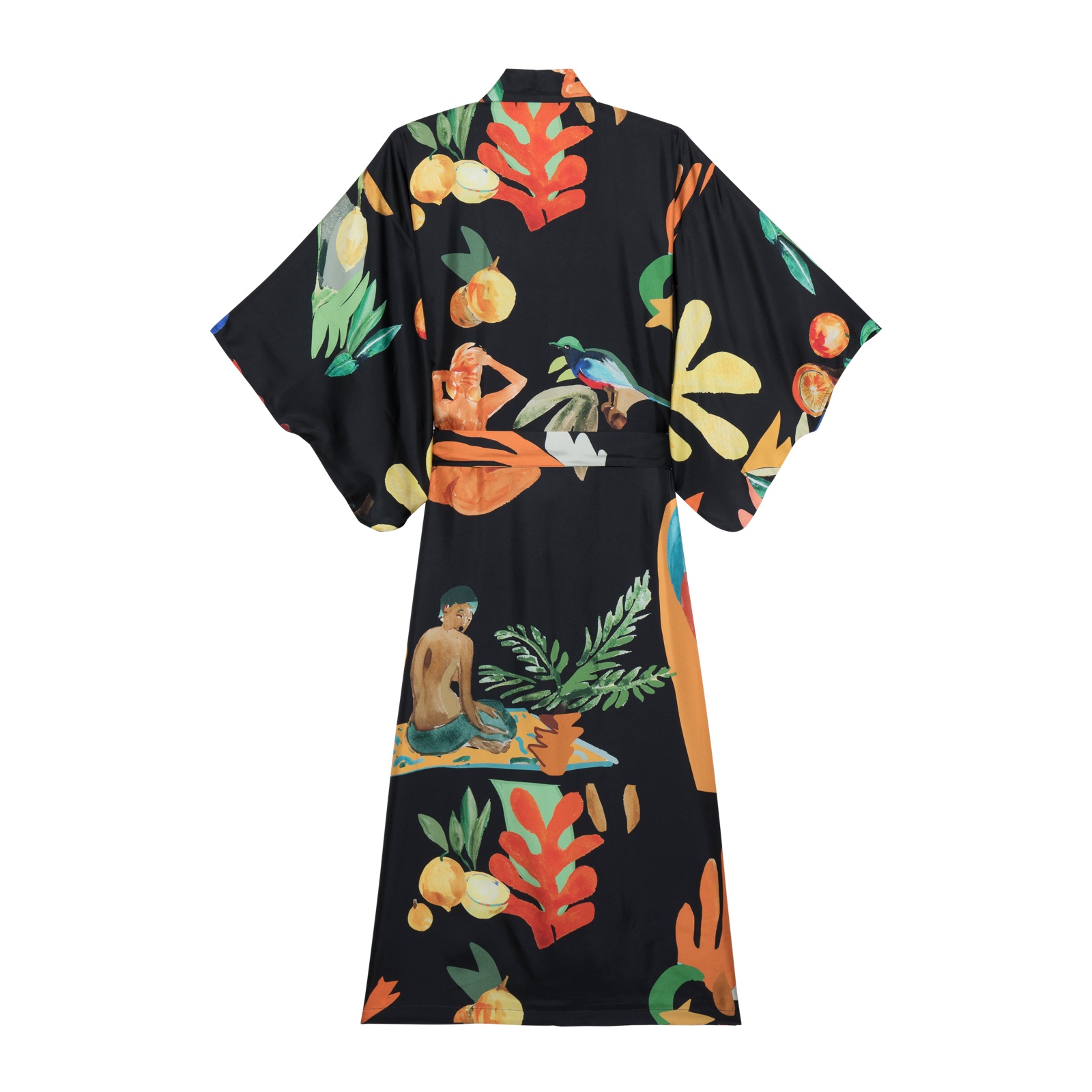 - The Kimono has 3/4 sleeves and a silk belt printed with the same design.