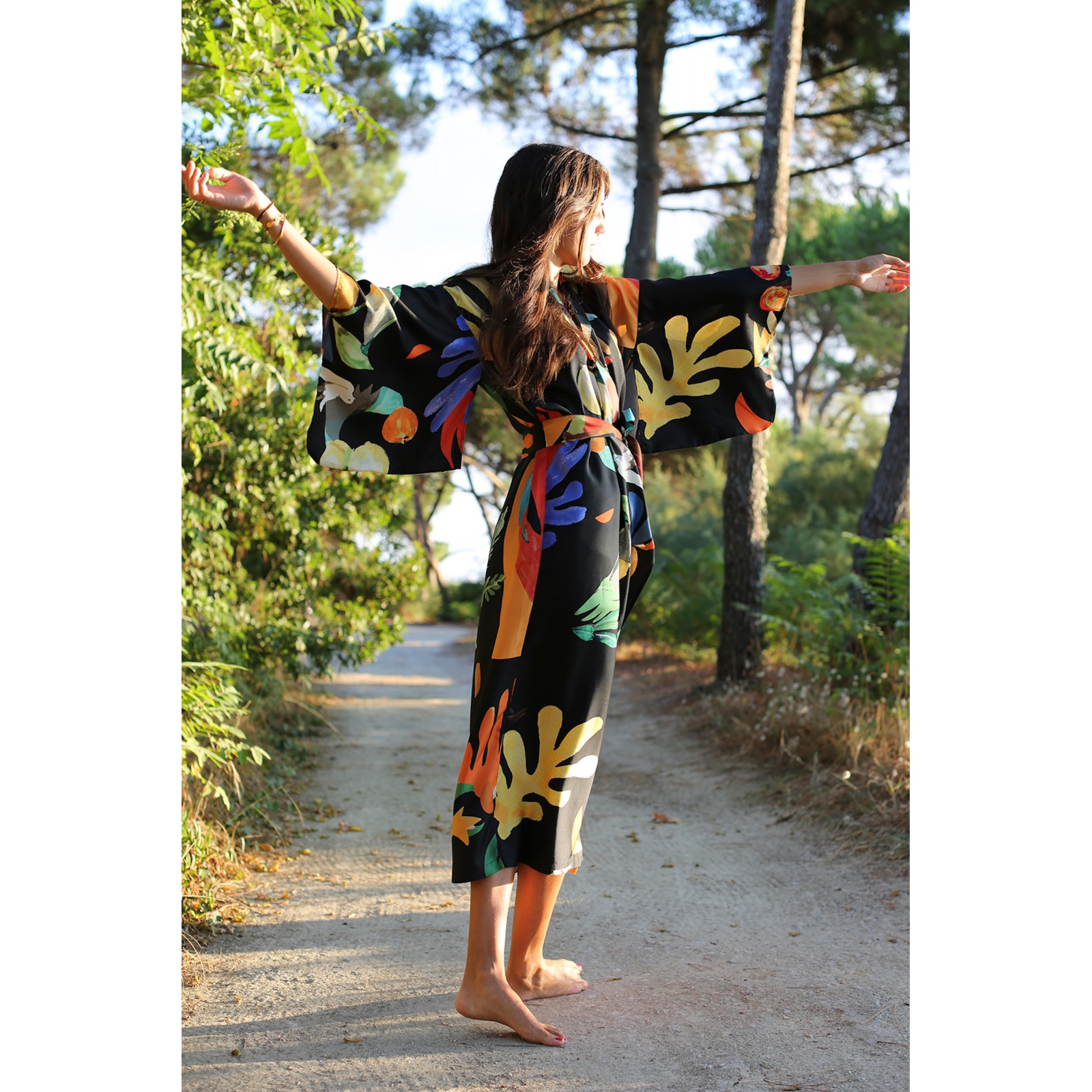 - Tips: this kimono can be worn casually, open over jeans, or alone, belted, elegant in the evening.