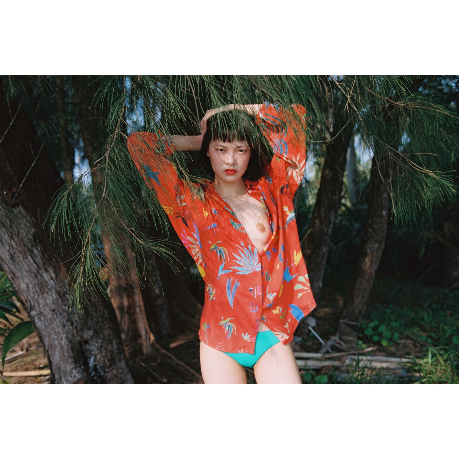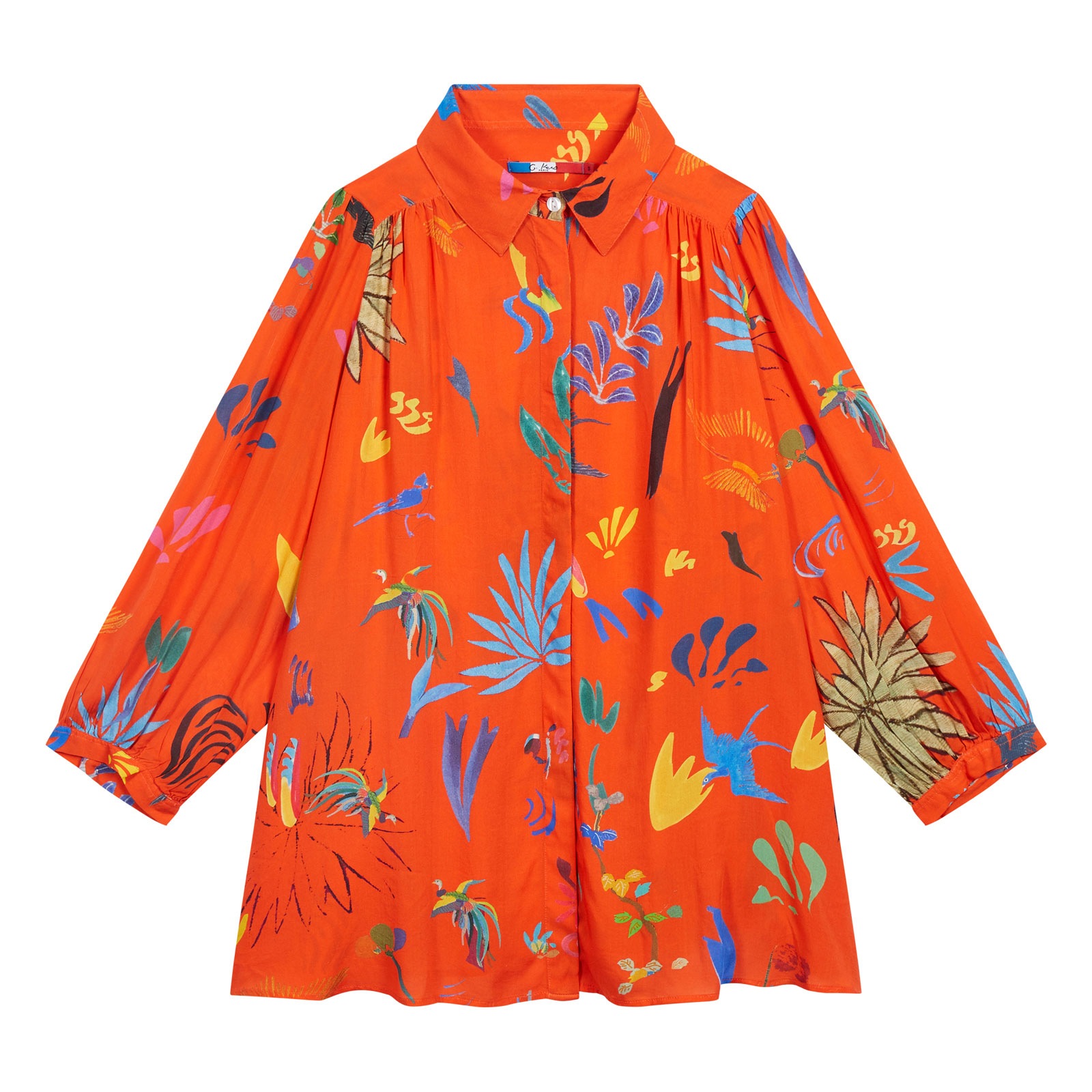 Red ultra soft viscose blouse. Invisible front button closure, classic shirt collar and ¾ sleeves with one button cuffs. Japanese patterns print all over. One of a kind. Numbered serie. The name of this artwork is "Tangerine Red".