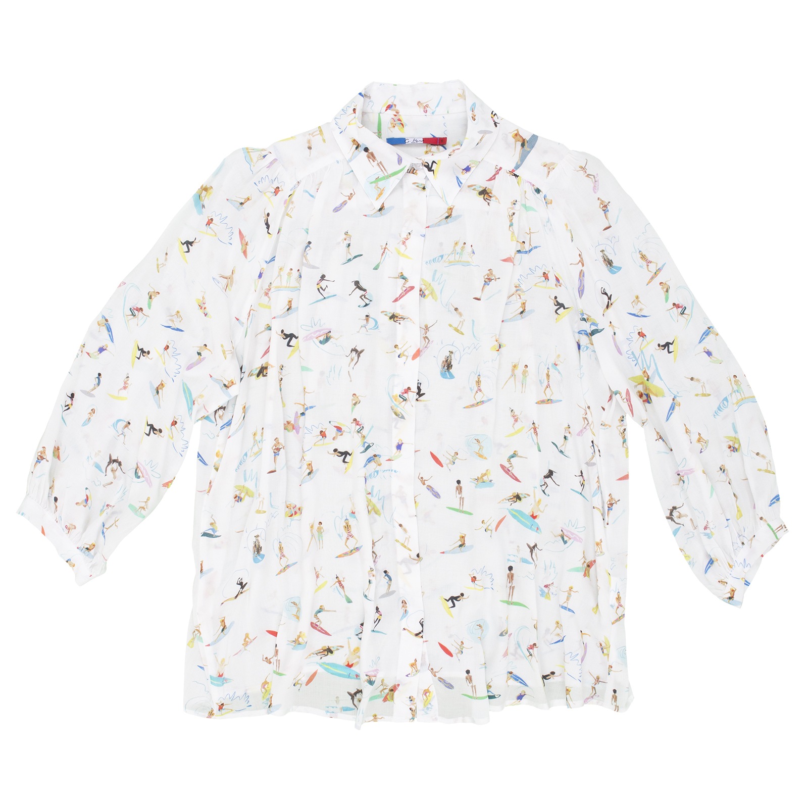 Ultra soft viscose blouse. Invisible front button closure, classic shirt collar and ¾ sleeves with one button cuffs. Surfers print all over. One of a kind. Numbered serie. The name of this artwork is "Super Surfeurs".