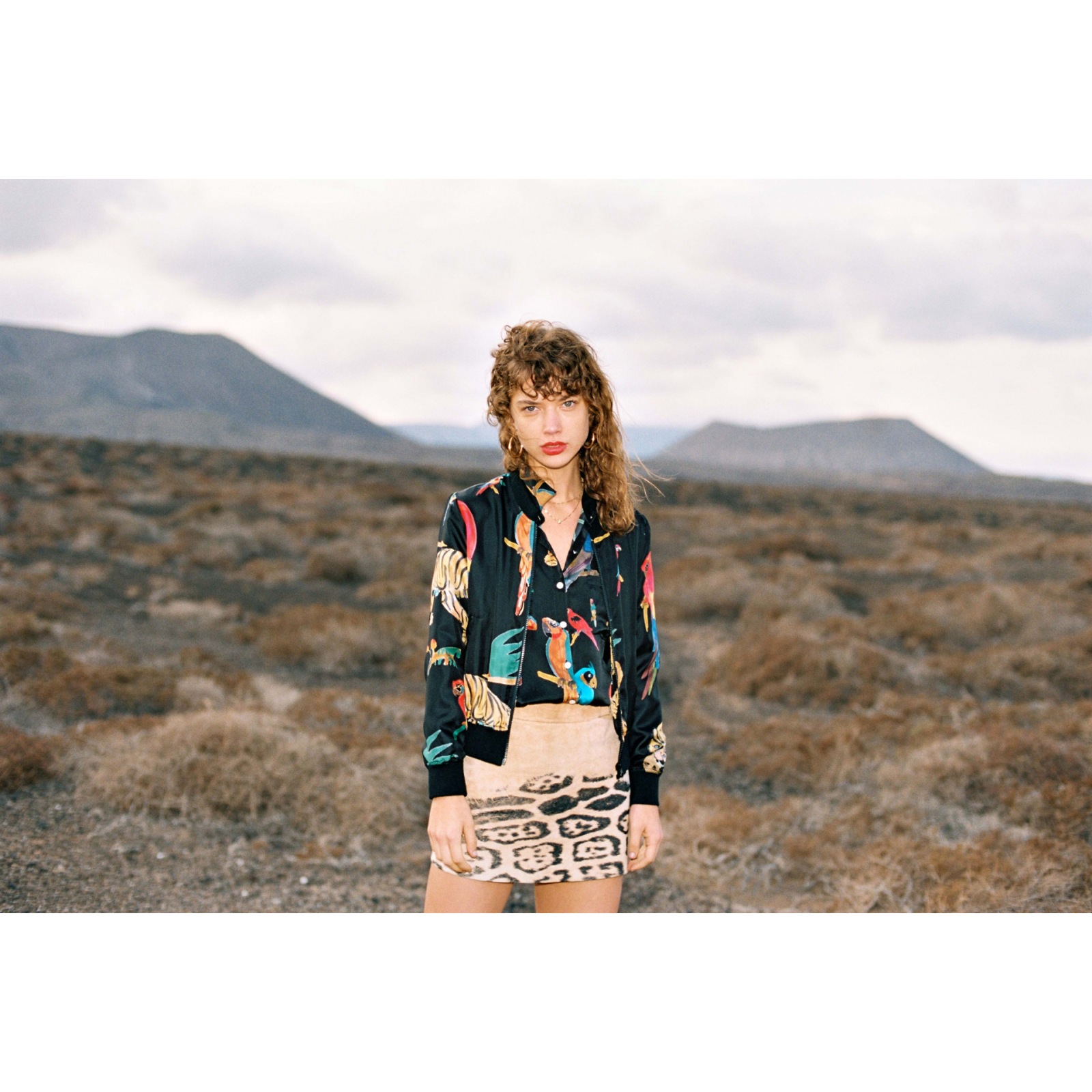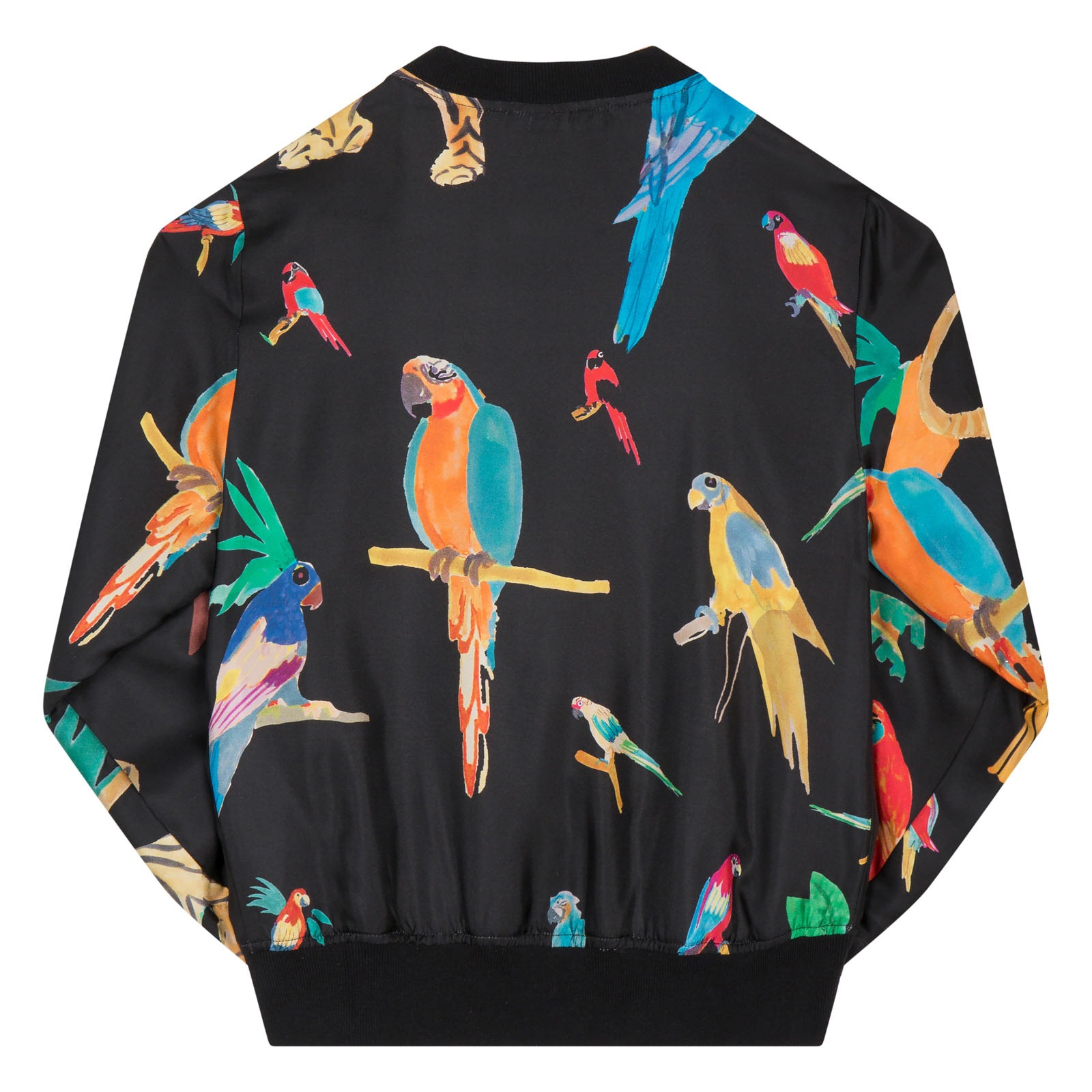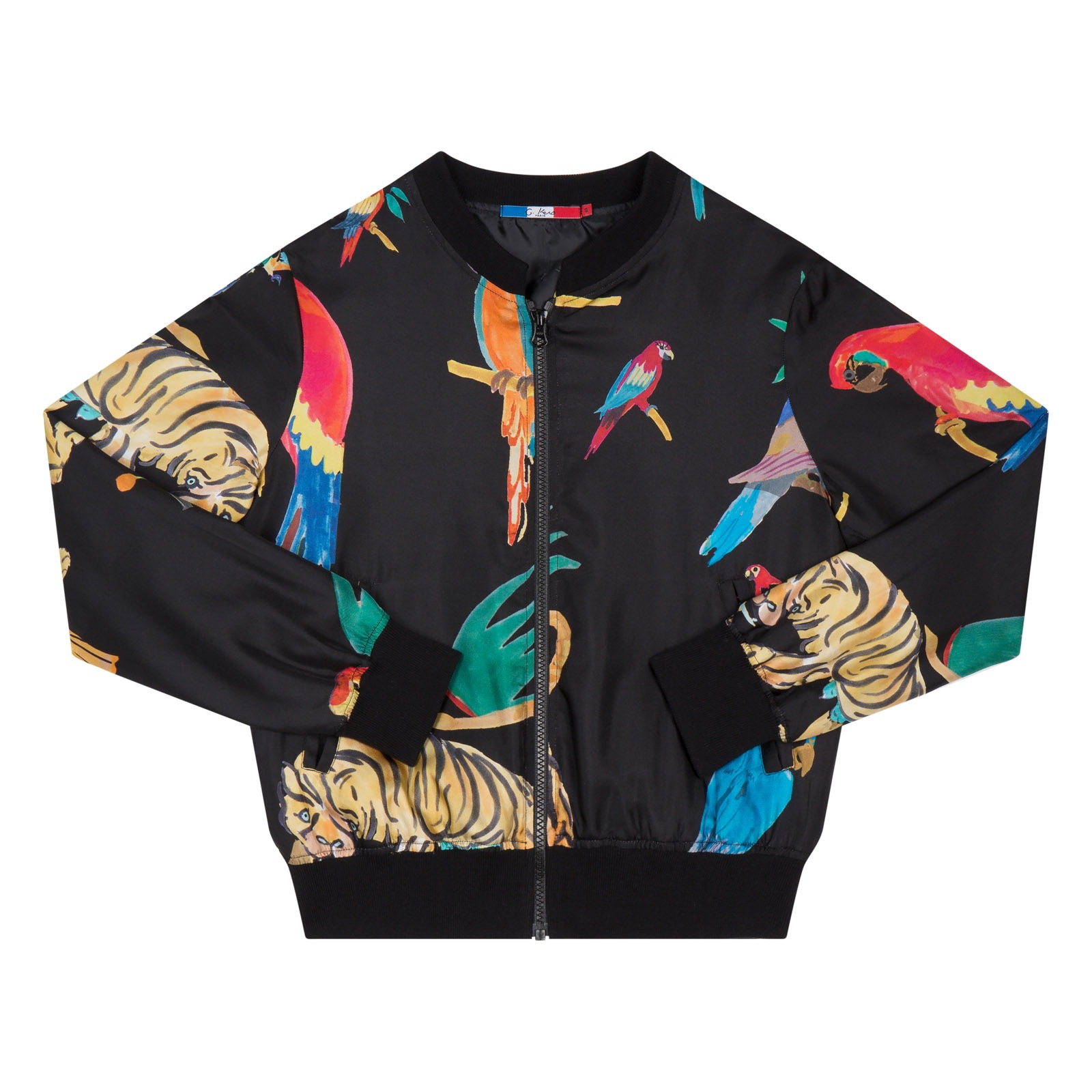 Black high quality silk jacket with all over colorful wild animals print. Zipper (YKK) closure through front, rounded collar, and slanted hand pockets at both sides. Covered elastic banding at cuffs and bottom hem. One of a kind. Numbered serie. The name of this artwork is "Black Jungle".