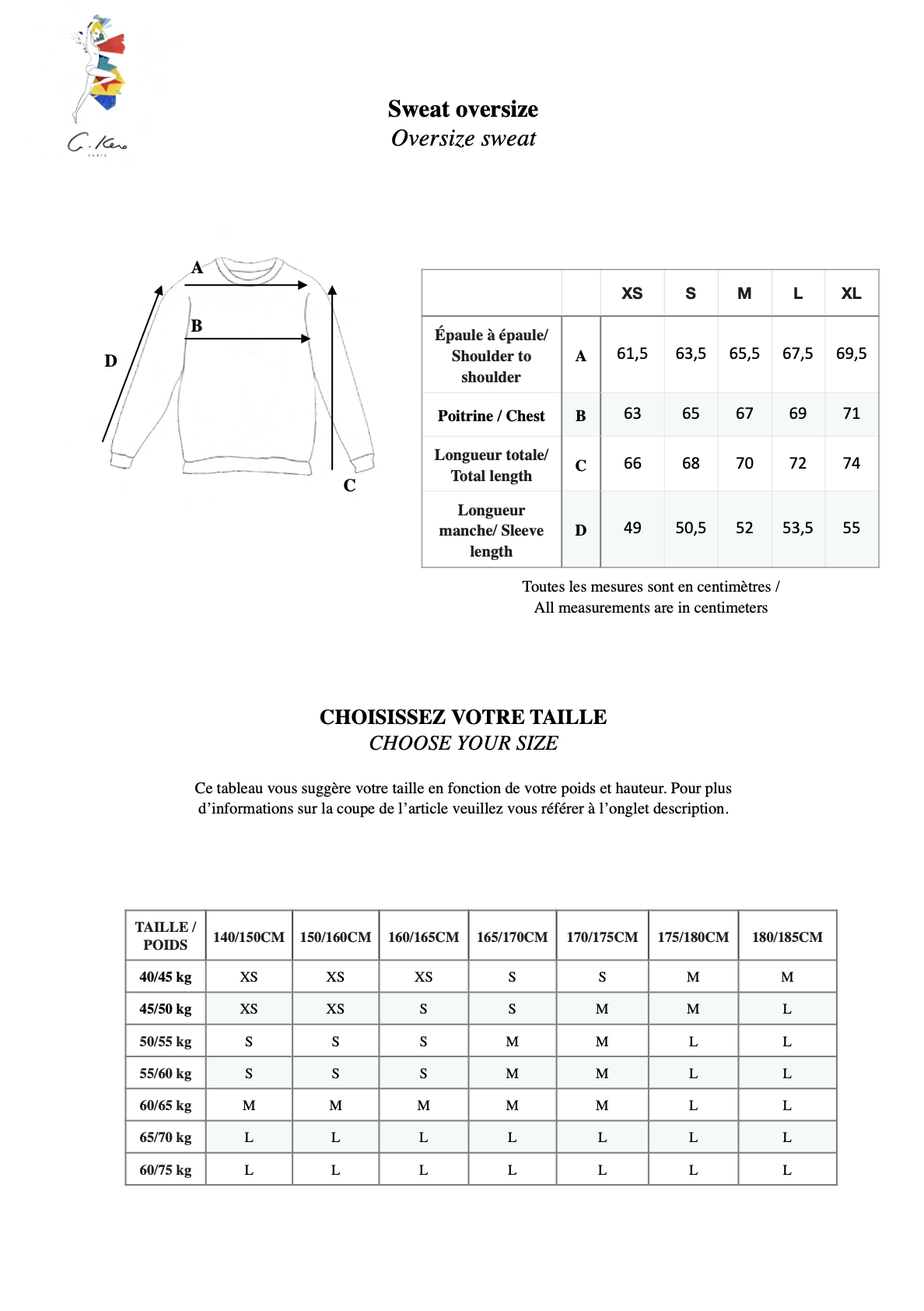 Advice: Sweatshirts with an oversized fit with and boyish look. Take one size down from your usual size.