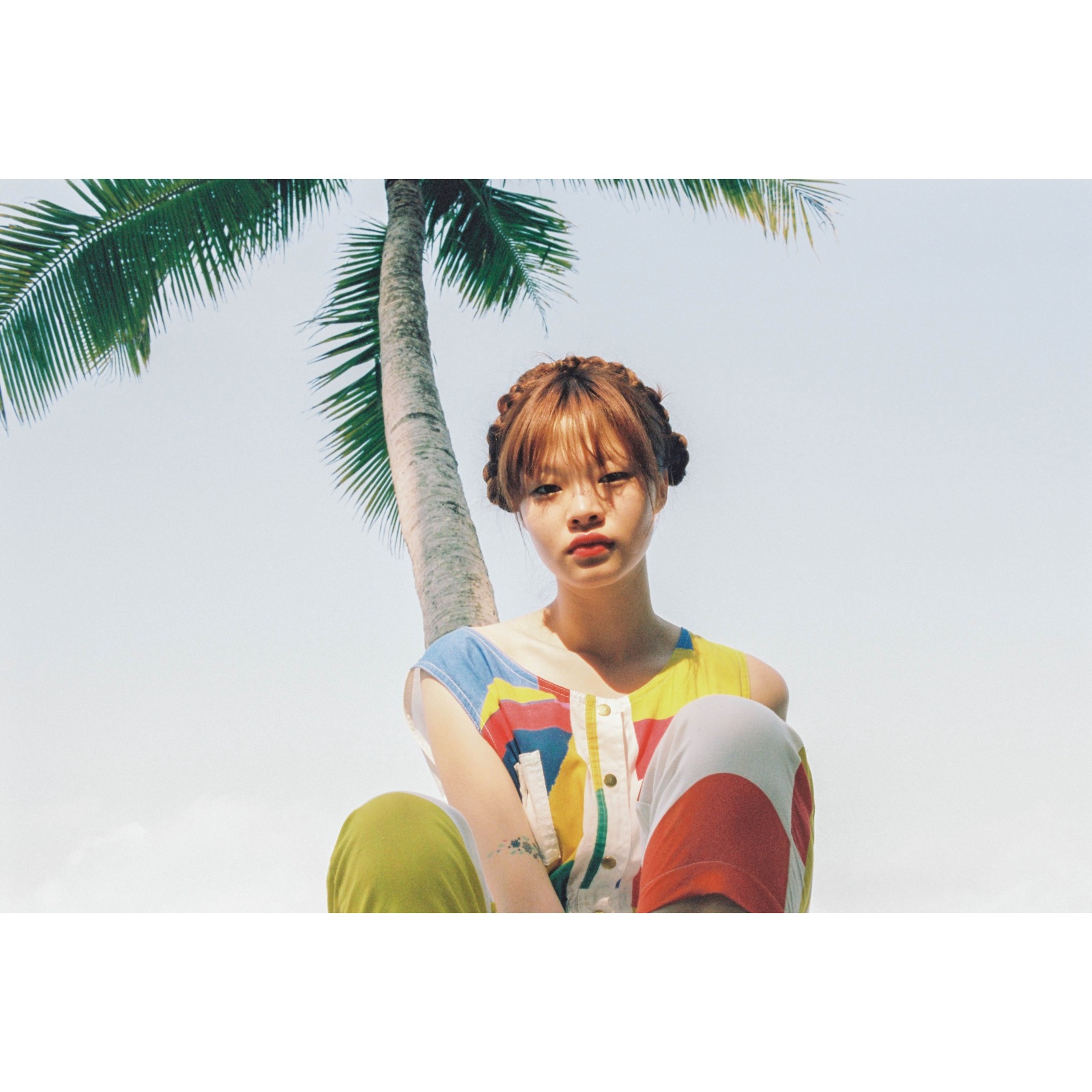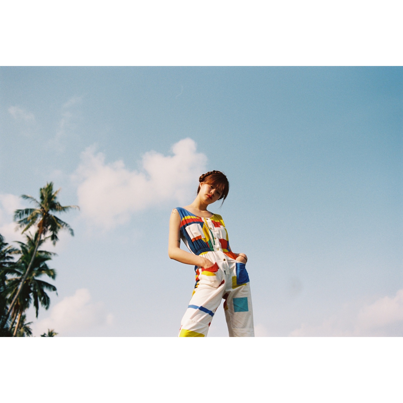 Cotton Jumpsuit. Red blue and yellow geometric graphics print all over. Button up in the front with rounded collar, elastic banding at the waistline and front hand pockets on both sides. One of a kind. Numbered serie. The name of this artwork is "Geometrie Minimale".