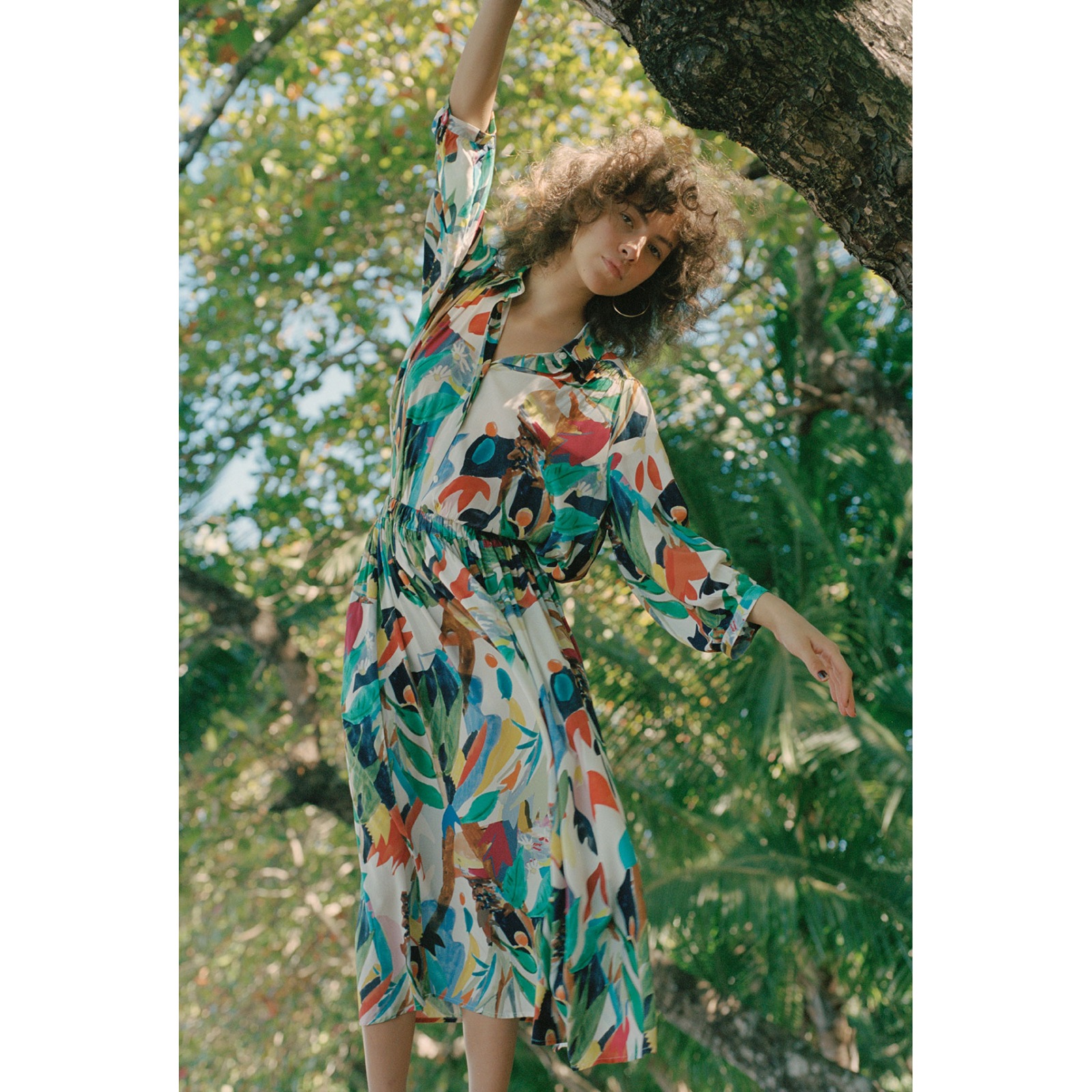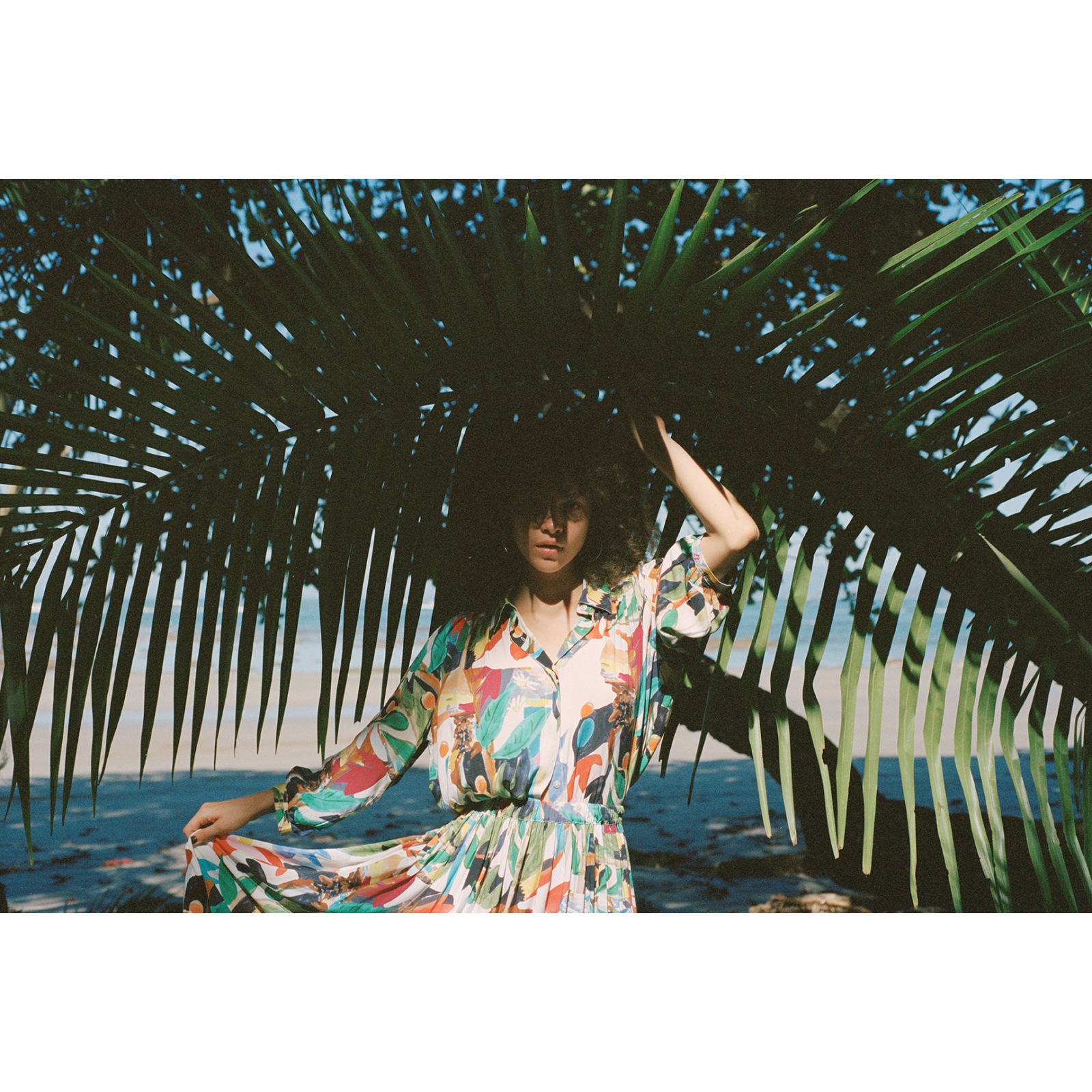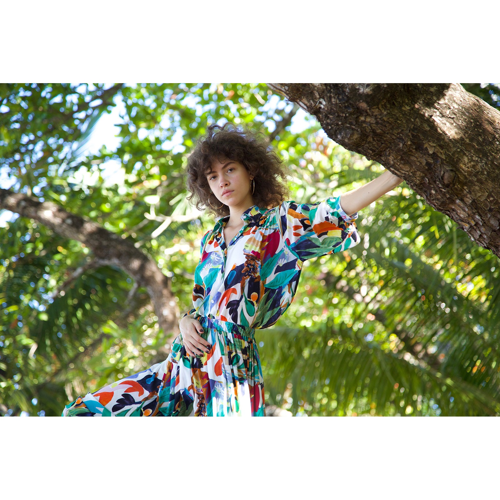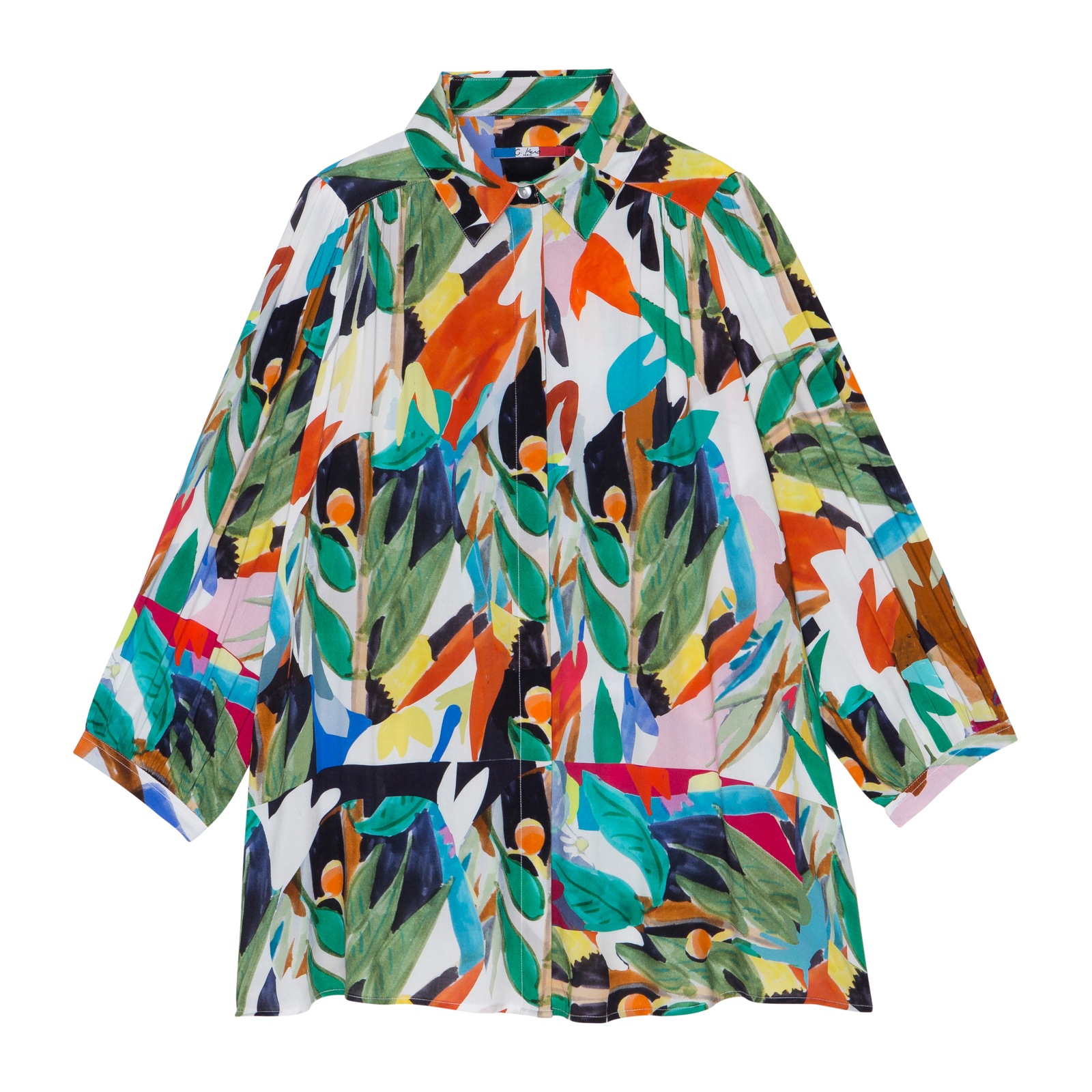 Blouse en viscose fluide, coupe évasée. Manches ¾ bouffantes. Un ourlet dissimule la boutonnière sur le devant. Boutons en nacre sur le poignet. Peut se porter casual par-dessus un maillot de bain ou plus structurée rentrée dans un jean. Imprimé de fruits colorés et exotiques. Le nom de ce dessin est "Fruits Fruits".