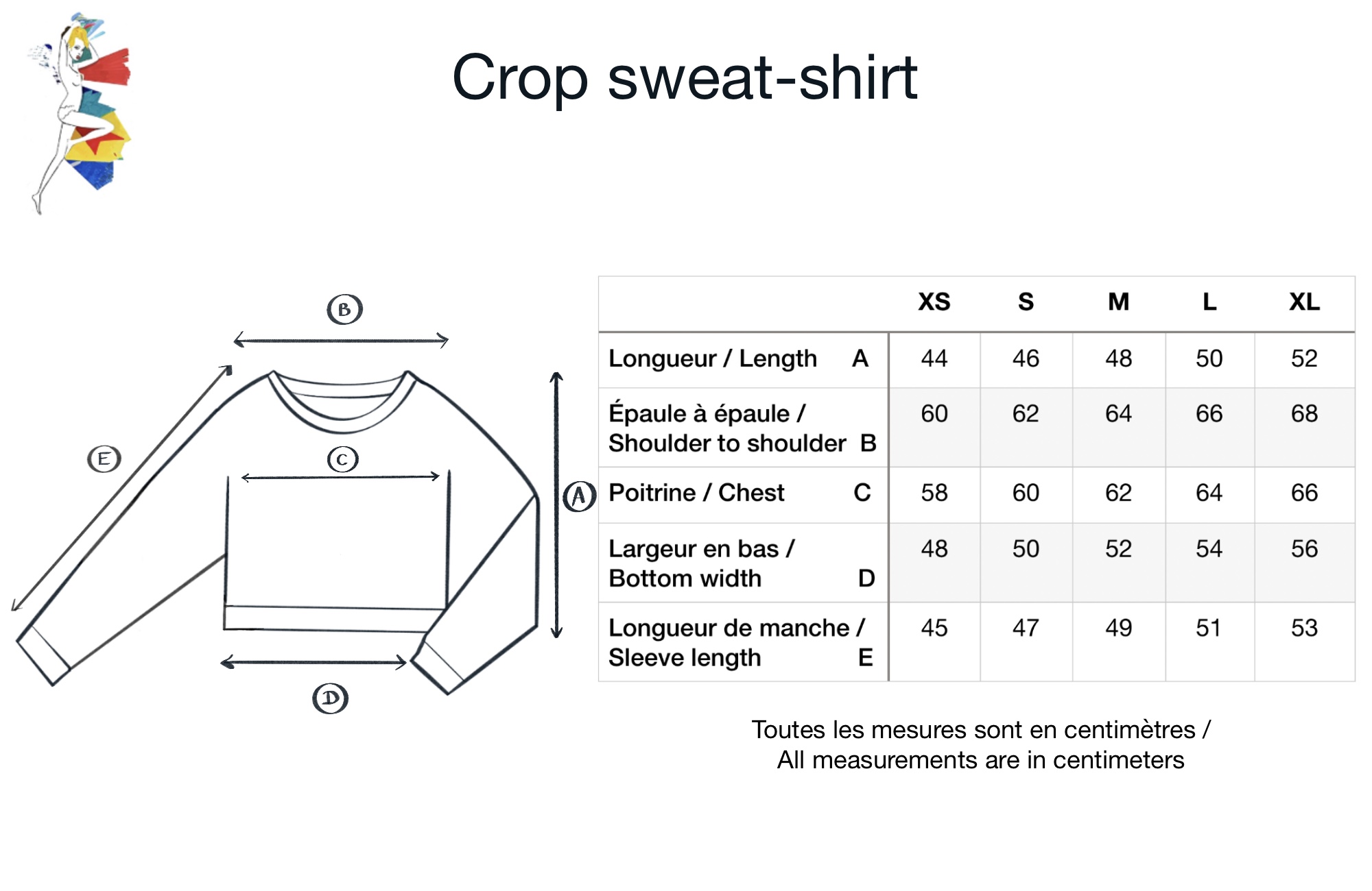- Conseils : le sweat-shirt crop peut se porter de façon casual avec un short ou un pantalon taille haute. Ce sweat taille très petit.
