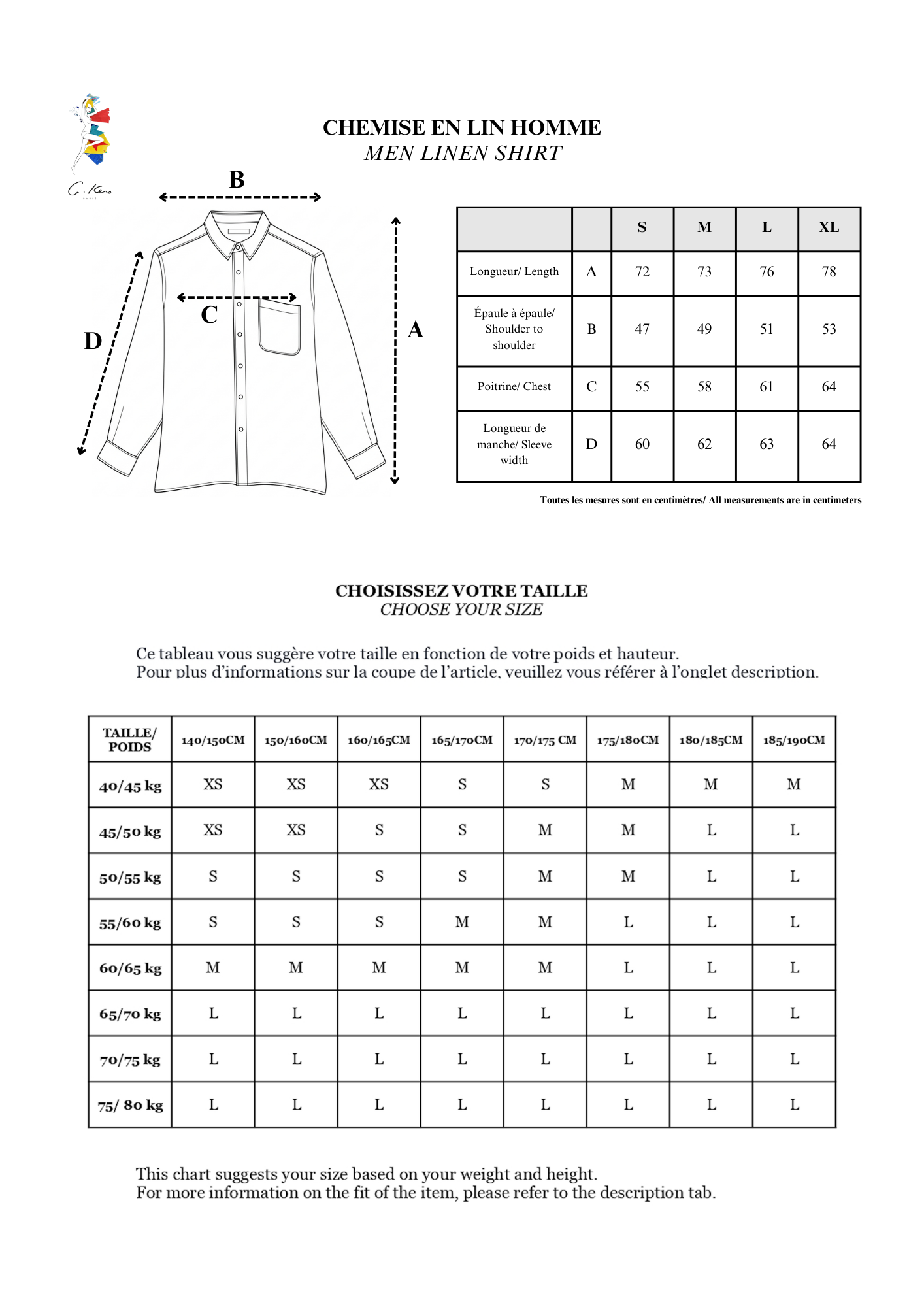 Chemise en lin. Boutonnière sur le devant de la chemise et poignets avec boutons en nacre. Poche sur le côté gauche de la chemise au niveau de la poitrine. Imprimé des paysages du Cap Ferret.