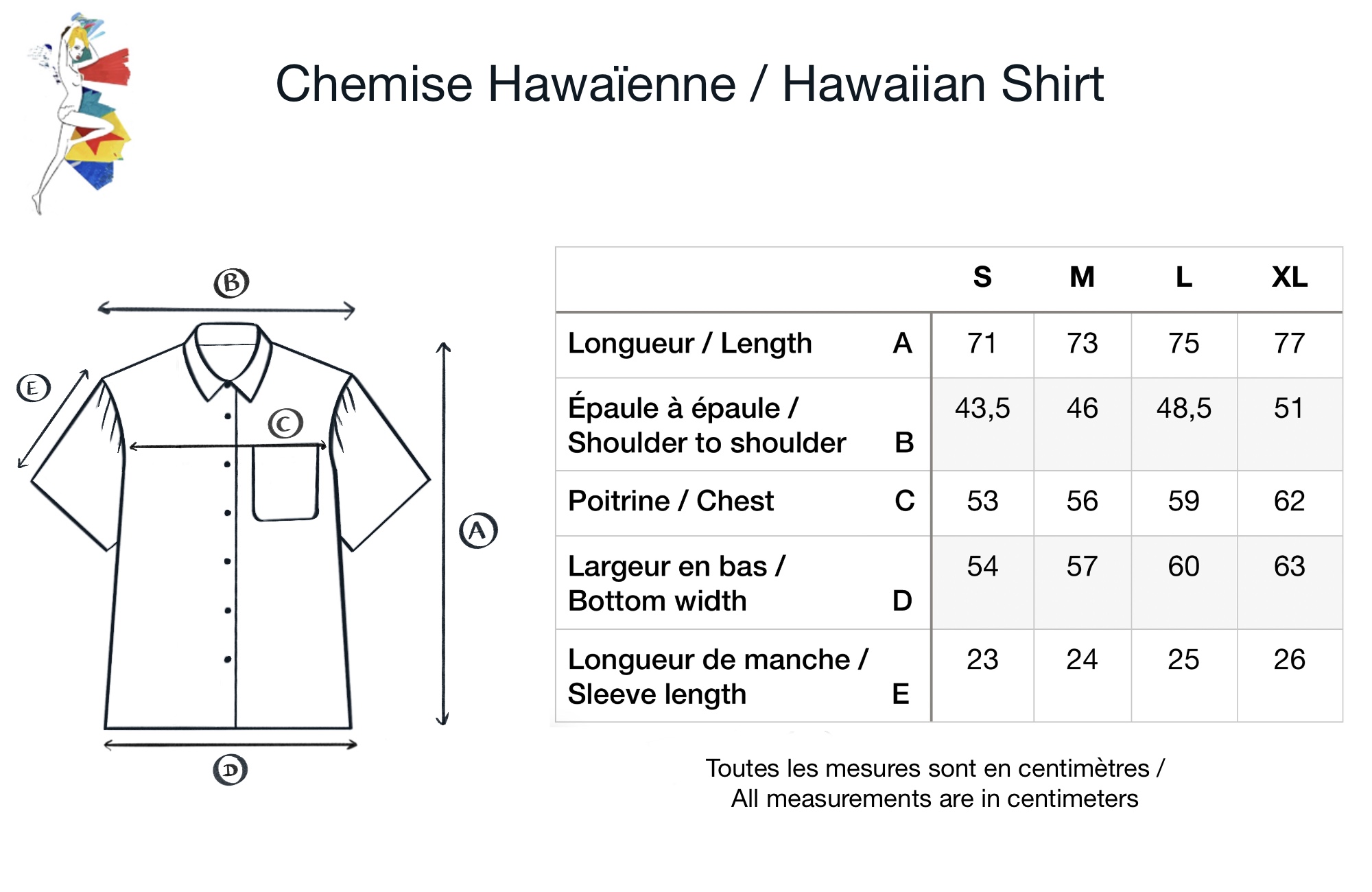 - Chemise hawaïenne homme à manches courtes en viscose, boutons en nacres et poche au niveau de la poitrine sur le côté droit.