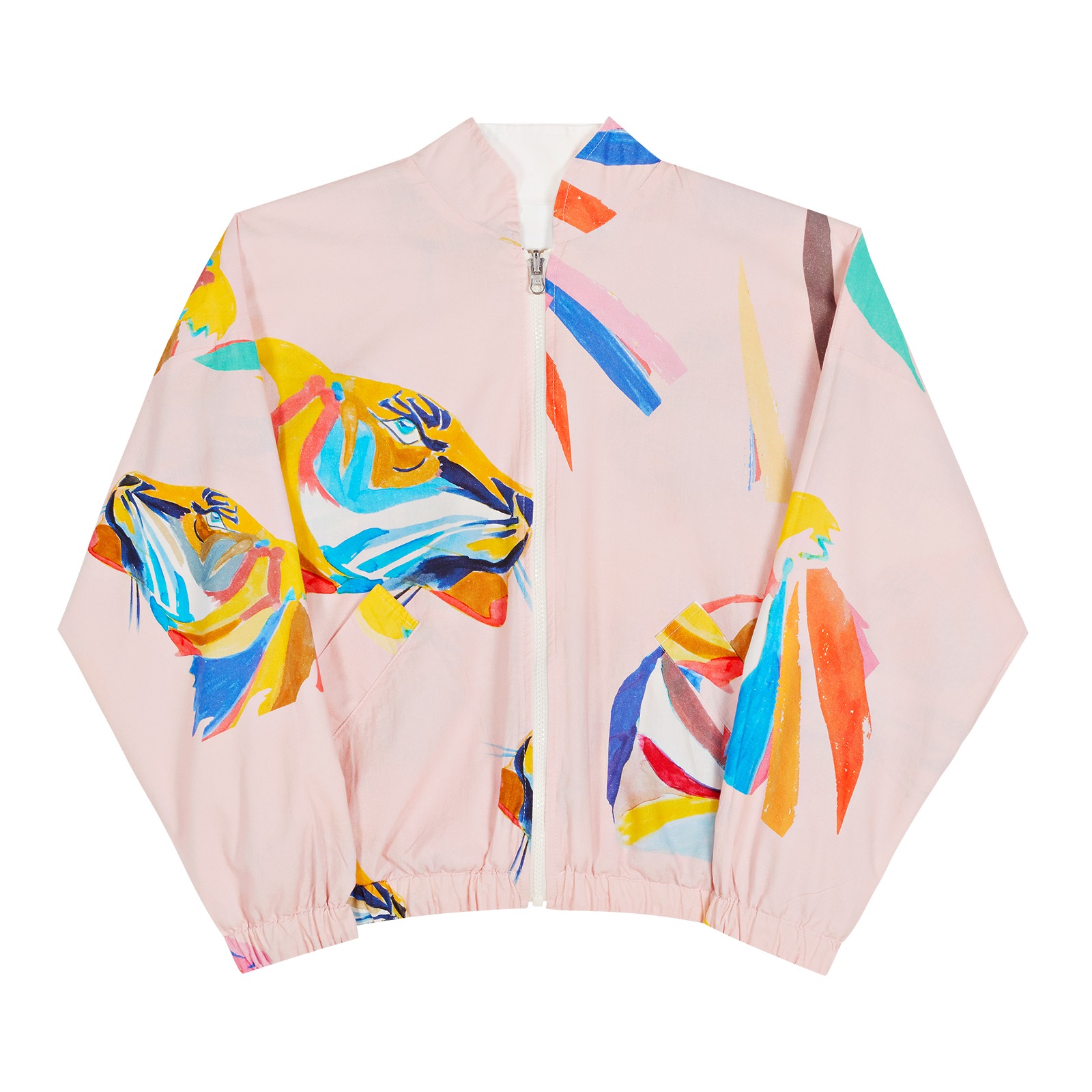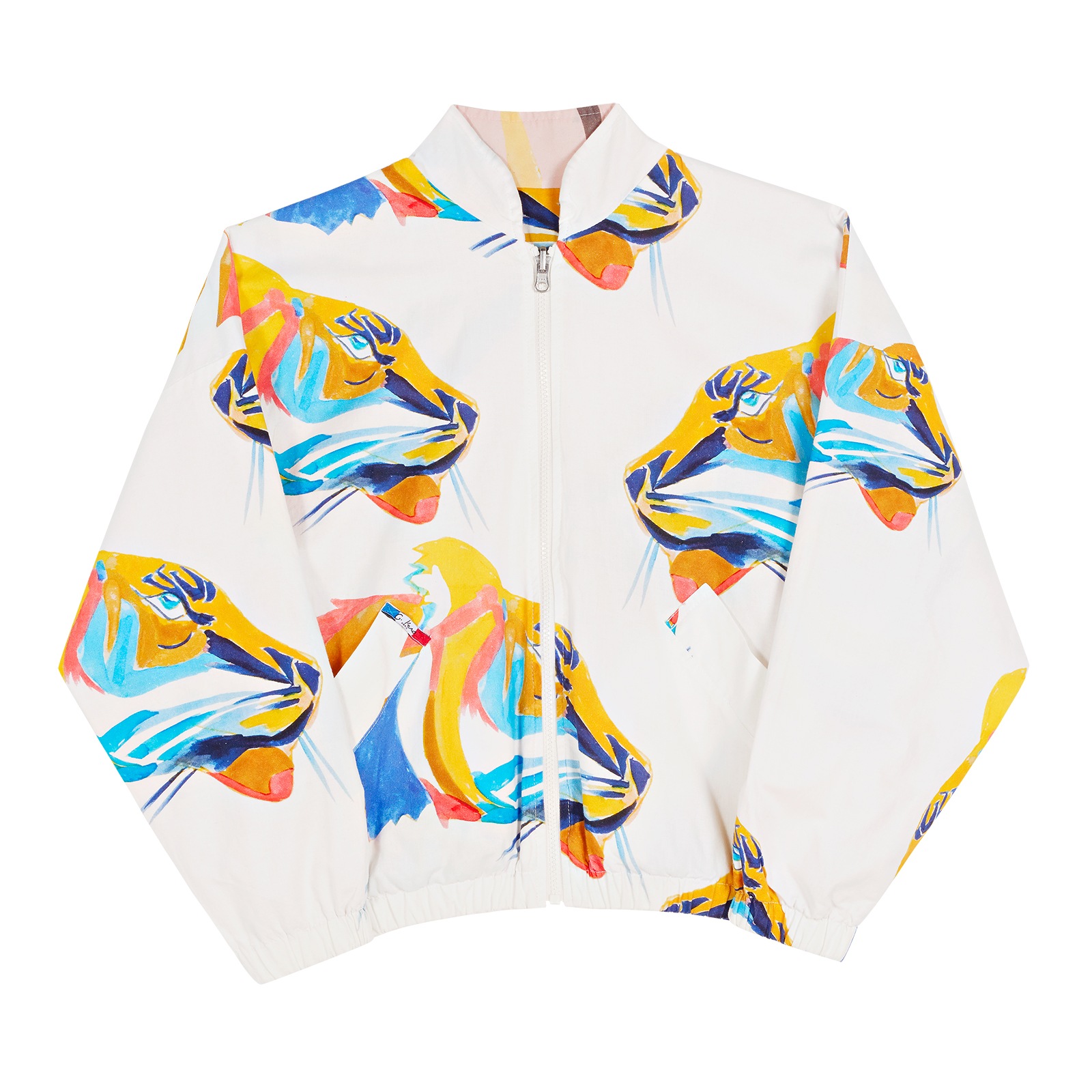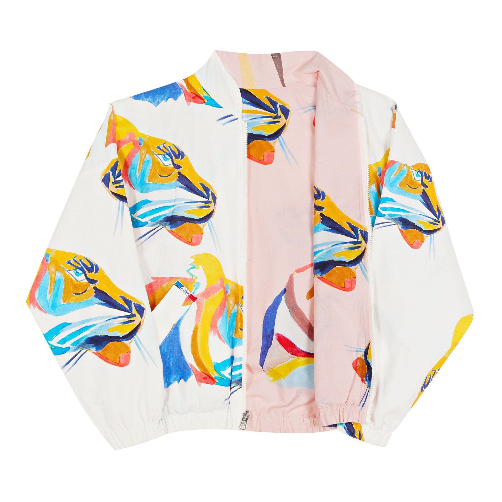 Teddy réversible en coton, coupe chauve-souris. Fermeture zip (YKK) sur le devant. Resserré par un élastique sur les poignets et en bas. Deux poches côtés. Imprimé de têtes de tigre muticolores. Reversible : un côté rose / un côté blanc. Le nom de ce dessin est "Master Zazans". Chaque pièce G.Kero est numérotée et éditée en série limitée.